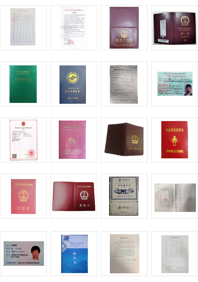 各類公證書(shū)、委托書(shū)、出國(guó)材料、合同公證、錄取通知書(shū)、在讀證明、學(xué)歷證書(shū)、學(xué)歷證、學(xué)位證書(shū)、學(xué)位證、學(xué)歷公證、畢業(yè)證、畢業(yè)證書(shū)、會(huì)計(jì)證、成績(jī)單、戶口簿、證明材料、死亡證明、身份證、單身證明、健康證、許可證、營(yíng)業(yè)執(zhí)照、護(hù)照、駕照、簽證、移民、移民材料、移民資料、邊境證、出入境證件、結(jié)婚證/離婚證、婚姻證明、無(wú)犯罪證明、出生證、資格證書(shū)、涉外公證、委托公證、收入證明、房產(chǎn)證等等。